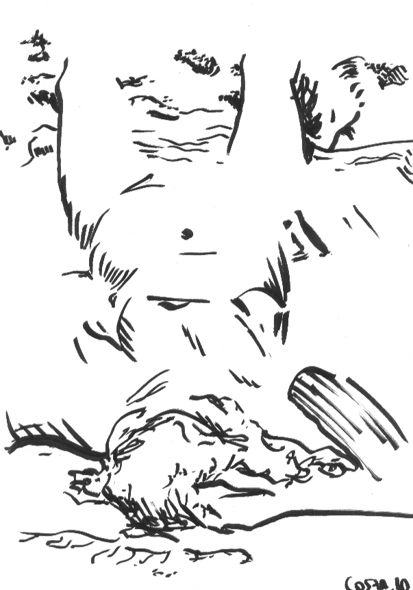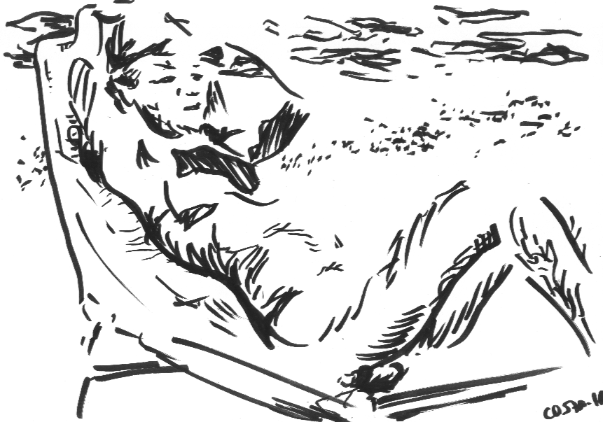 Eu não falava nada com as pessoas, mas algumas notaram que eram desenhadas, porque o comum é olhar diretamente pra alguém que o acompanha ou pro horizonte. Eu quebrava a regra. Uma mulher colocava a mão discretamente em frente às partes mais vergonhosas e teve até uma que o acompanhante encobriu, colocando a cadeira dele virada de lado para o mar, entre mim e a moça. A praia e suas figuras diversas!