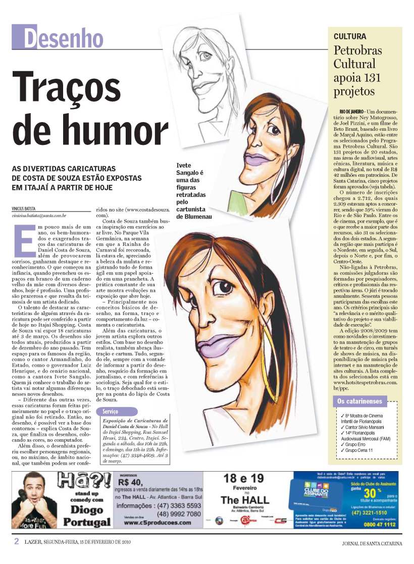 Jornal de Santa Catarina noticia a exposição fevereiro 17, 2010 por Costa de Souza Deixe um comentário Leia direto no site do jornal. Related Autor: Costa de Souza Artista gráfico. Caricaturas e ilustrações.
