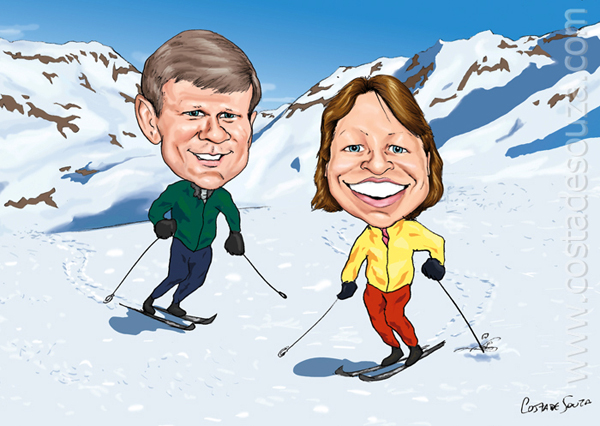 Caricatura por encomenda para cliente de Blumenau. Trabalho completo, com cenário e situação específica. Encomendada pelos filhos para presenteá-los na volta das férias geladas e com muito esqui.