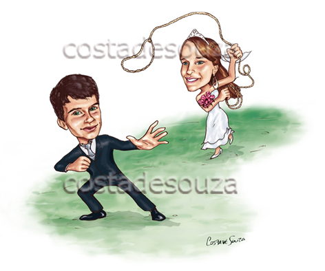 Caricatura para casamento usada em convite e lembranças, para cliente de Rio do Sul (SC). Feita em 2011. As caricaturas também podem ser emolduradas como quadro ou aplicadas a diversas superfícies, como geladeira, parede, carro ou objetos.