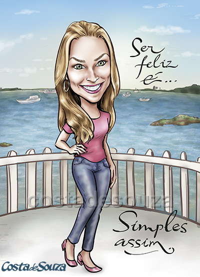 Caricatura para uso como quadro em casa. Encomendada para presentear uma pessoa especial. O cliente pediu para incluir no desenho a frase “Ser feliz é… Simples Assim”. Para essa frase desenvolvi o lettering buscando representar a leveza e plenitude do momento.