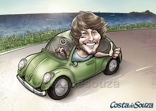 Caricatura para presentear o namorado com um quadro. Ele adora andar com seu Fusca pelo litoral. A cliente pediu que a imagem mostrasse o mar e que fosse uma caricatura bem alegre, inclusive com muito humor na representação do rosto do homenageado.