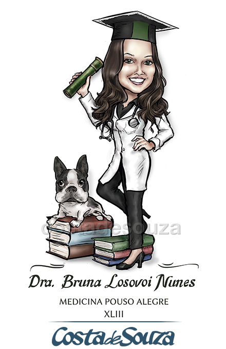 Caricatura para formatura de Medicina. Formanda com sua cachorra.