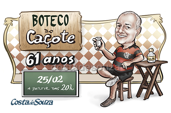 Caricatura para festa de aniversário com tema Boteco. O aniversariante completou 61 anos e comemorou tomando cachaça.