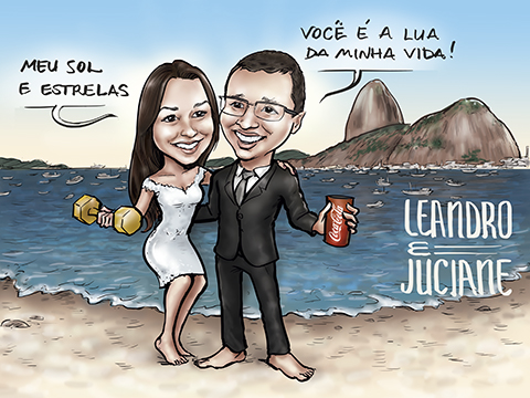 Caricatura para casamento. Noivos na Lagoa Rodrigo de Freitas, no Rio de Janeiro, com o Pão de Açúcar ao fundo. Ela adora musculação e ele pediu para estar segurando um copo de Coca-Cola.