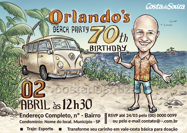 Caricatura para festa de aniversário de 70 anos com tema Praia. O aniversariante adora passear com sua Kombi pelo litoral.