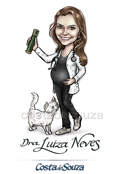 Caricatura para formatura de Medicina. Formanda grávida e sempre na companhia do seu gato.