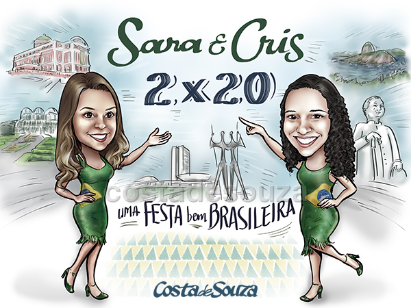 Caricatura de amigas para festa de aniversário em conjunto. Elas já estiverem em vários lugares do país, e escolheram como tema da festa a cultura brasileira.