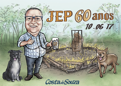 Caricatura para aniversário de 60 anos com tema churrasco fogo de chão. A cliente pediu que o aniversariante aparecesse aos lados dos seus dois cachorros.