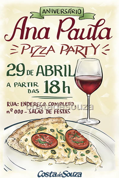 Hoje, 10 de julho, é o Dia da Pizza, pelo que indicam os memes nas redes sociais. Sobre a origem da data, a única informação que encontrei é de que foi instituída por um ex-secretário de Turismo de São Paulo, em 1985. Mas os fãs dessa delícia não precisam de mais histórias compridas pra comemorar. Comemoração puxa pizza, que puxa convidar os amigos e a família, e puxa esse convite criativo que uma cliente encomendou no início do ano pra sua festa de aniversário.