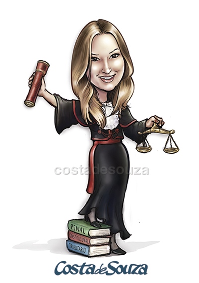 Caricatura para formatura em Direito. Formanda com diploma, balança e livros.
