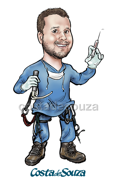 Caricaturas para formatura de Medicina. Os 3 formandos deram uma festa juntos e pediram para estar com roupa de cirurgia e algumas referências à personalidade de cada um.