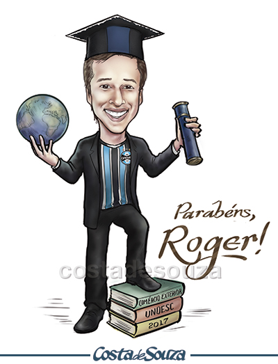 Caricatura para formatura em Comércio Exterior. O formando é torcedor do Grêmio e a cliente pediu que ele estivesse com a camisa do time aparecendo por baixo do traje social.