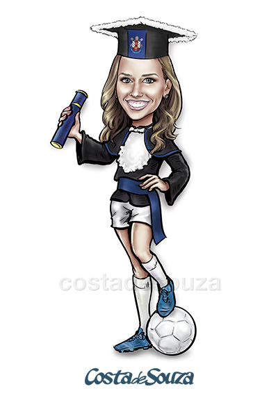 Caricatura para formatura em Administração. A formanda adora futebol e pediu para estar com calção, meiões e chuteiras por baixo da beca.