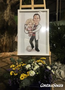 Caricatura para formatura de Medicina. Formando com sua filha no colo, bola de futebol e camisa do Flamengo.