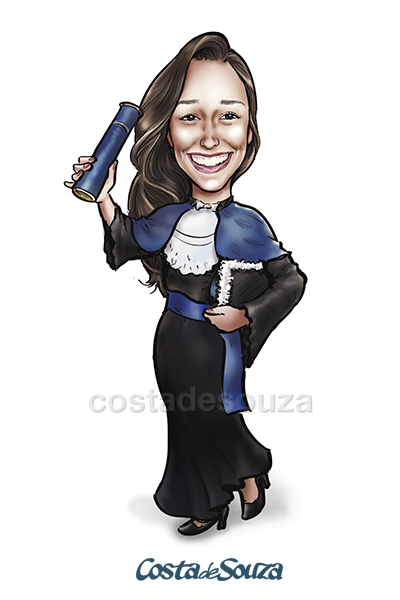 A caricatura para formatura pode ser aplicada em banner, totem, display de mesa, quadro na recepção e produtos personalizados da festa como copos, canecas e chinelos. Também pode ser utilizada como post nos perfis pessoais no Facebook e no Instagram, para comemorar a conquista.