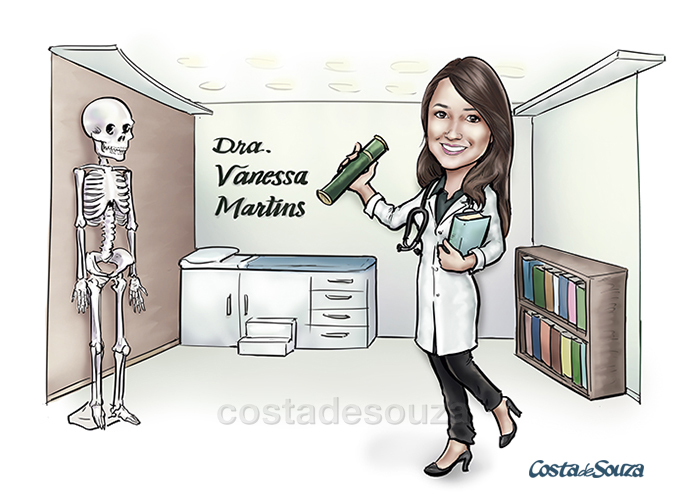 Caricatura para formatura de Medicina. Formanda em seu consultório, com a mesa para exame clínico, esqueleto em tamanho real, e estante com livros. Na parede, o nome da formanda com um lettering desenvolvido em harmonia com a caricatura.