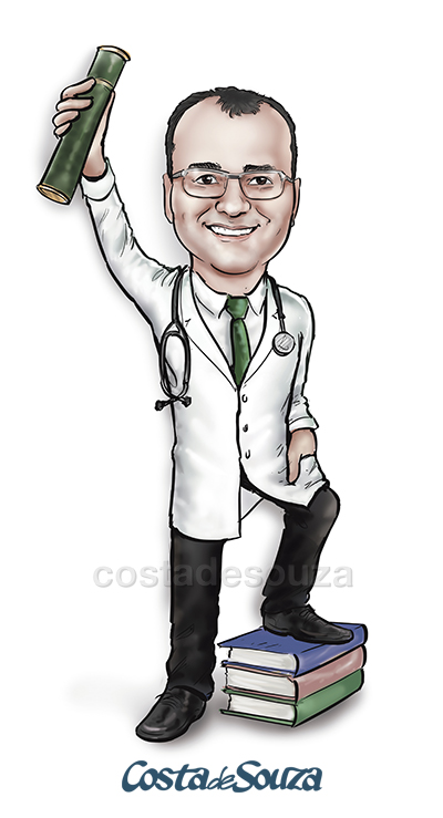 Caricatura para formatura de Medicina. Encomenda na opção Colorida, sem adicionais. Desenho do formando com diploma, estetoscópio e livros.