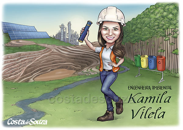 Caricatura para formatura em Engenharia Ambiental. Formanda com cenário incluindo vários elementos relacionados à profissão: bacia de rejeitos de mineração, curso d’água, painéis de energia solar, lixeiras de coleta seletiva, plantação de eucalipto e uma indústria ao fundo.