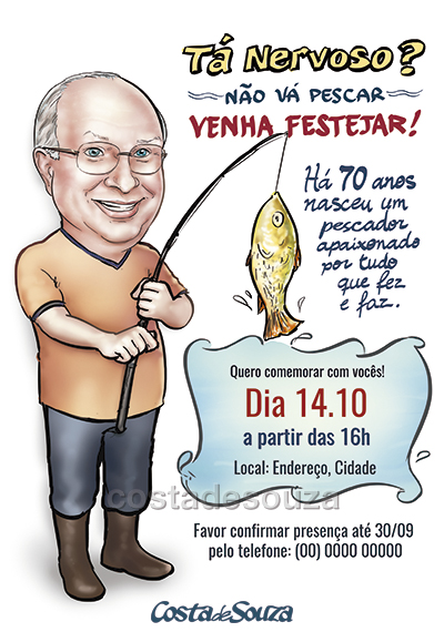 Caricatura para aniversário de 70 anos. O aniversariante adora pescar, e os clientes pediram estas frases no convite, fazendo referência à pesca. Para as frases foi desenvolvido um lettering em harmonia com a caricatura.