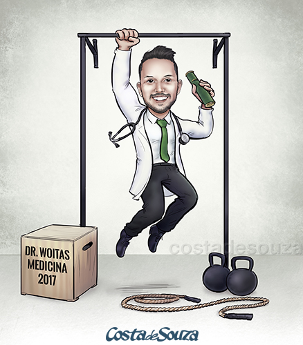 Caricatura para formatura de Medicina com tema Crossfit. Com caixote, corda e halteres.