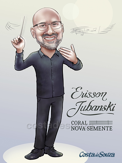 Caricatura para presente entregue como quadro. Os membros do coral homenagearam o maestro encomendando esta caricatura.