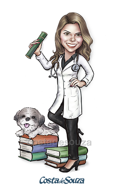 Caricatura para formatura de Medicina. Formanda com cachorro e livros.