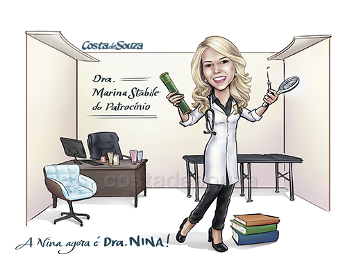 Caricatura para formatura de Medicina. A formanda pretende se especializar em Dermatologia, e pediu que o desenho mostrasse um consultório com diversos produtos na mesa. Na mão esquerda, ela segura uma seringa para injeção de botox e uma lupa dermatológica.