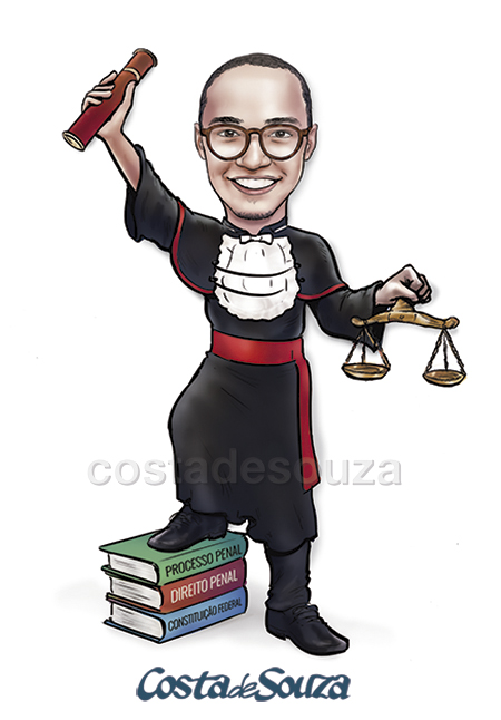 Caricatura para formatura de Direito. Formando com diploma, balança e livros.