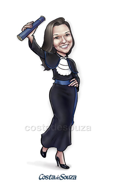 Caricatura para formatura em Publicidade e Propaganda. Formanda comemorando a conquista e erguendo o diploma.