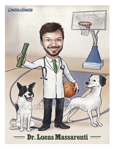 Caricatura feita sob encomenda para presentear um formando de Medicina. Ele joga basquete e tem dois cachorros, e a cliente pediu para que a caricatura mostrasse essas paixões.