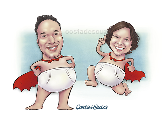 Caricatura para festa de aniversário de pai e filho, com tema Capitão Cueca. Os clientes pediram que a caricatura mostrasse os dois com o corpo e as roupas do personagem principal da animação.