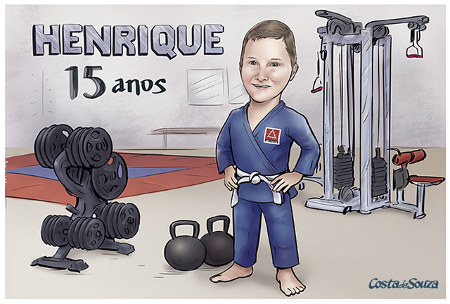 Caricatura para aniversário de 15 anos com tema Jiu-Jitsu e Crossfit. Os clientes pediram que a arte do convite mostrasse um ambiente de academia e o aniversariante com seu kimono, identificado com o símbolo da equipe de treinamento.