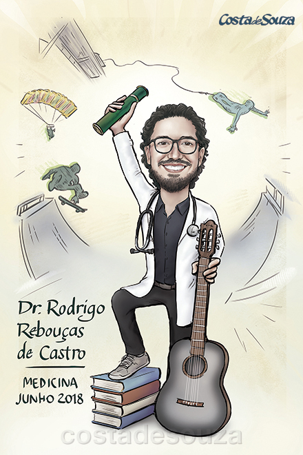Caricatura para formatura de Medicina. O formando adora praticar esportes radicais e tocar violão, e a cliente pediu que estas paixões estivessem retratadas na caricatura.