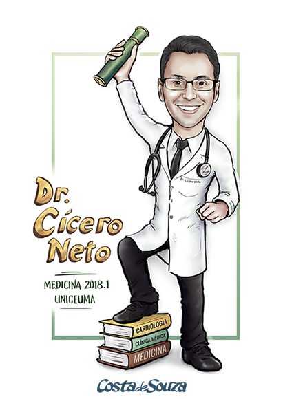 Caricatura para formatura de Medicina. Formando com estetoscópio e livros. Como adicional incluímos a escrita do nome e nome do curso, com um lettering especialmente elaborado para este projeto.