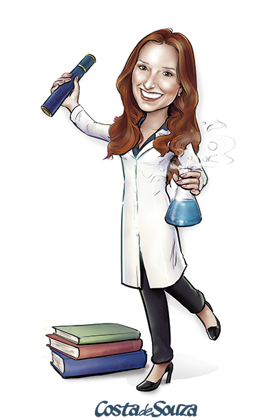 Caricatura para formatura em Engenharia Química. Formanda com diploma, erlenmeyer e livros.
