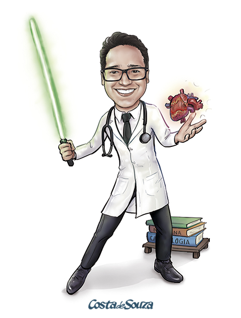 Caricatura para formatura de Medicina. O formando é fã de Star Wars e pretende se especializar em Cardiologia. Ele pediu que a ilustração destacasse esses temas.