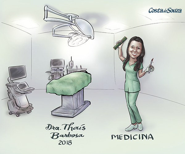 Caricatura para formatura de Medicina. A cliente pretende se especializar em Cirurgia e pediu que a ilustração aproveitasse esse tema.