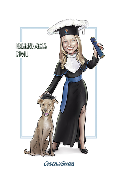 Caricatura para formatura em Engenharia Civil. Formanda e seu cachorro, com o nome do curso desenhado com letras personalizadas.
