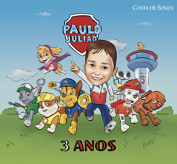 Caricatura aplicada em ilustração para banner de festa de aniversário de 3 anos, com o tema Patrulha Canina. Baseada em uma ilustração muito utilizada na divulgação da série.