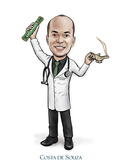 Caricatura para formatura de Enfermagem. Formando com a lâmpada que simboliza o curso.