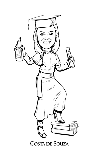 Caricatura em preto-e-branco para formatura em Processos Gerenciais. Formanda com diploma, livros e garrafa de cerveja.