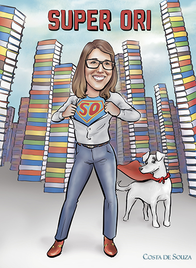 Caricatura encomendada para presente como quadro, de uma estudante para sua orientadora de pesquisa. A cliente pediu que o cenário fizesse referência a Metrópolis, do Super-Homem, mas com uma pilha de livros em lugar dos prédios, e que a professora aparecesse como “Super Orientadora”, ou”Super Ori” pros amigos.