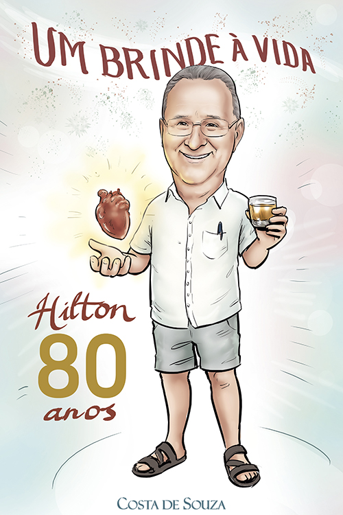 Caricatura para aniversário de 80 anos. O aniversariante passou por uma cirurgia recente e a cliente pediu pra fazer referência a essa experiência de vida.