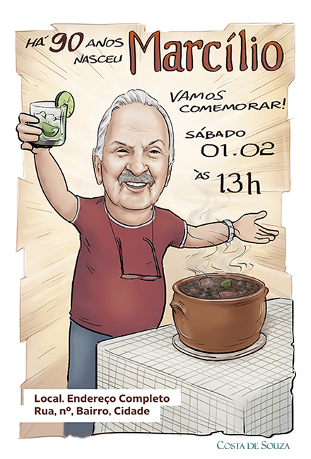 Invitation art with caricature for a 90th birthday party with Feijoada theme.