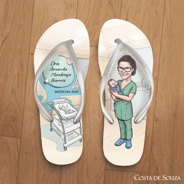 Caricatura para formatura de Medicina, para formanda que deseja se especializar em Pediatria.  A cliente pediu que a caricatura fosse elaborada principalmente para aplicação em chinelos personalizados para presentear.