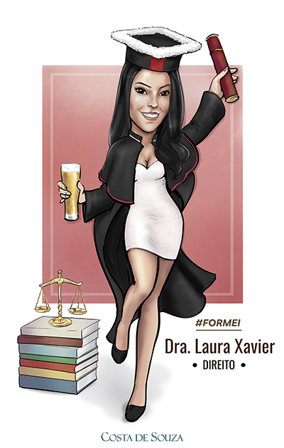 Caricatura para formatura em Direito. Formanda com diploma, copo de cerveja, livros e balança.