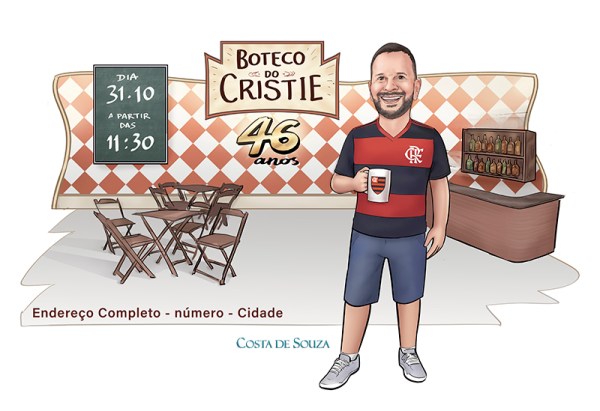 Caricatura para festa de aniversário de 46 anos, com tema Boteco. Encomenda na opção Colorida, completa.