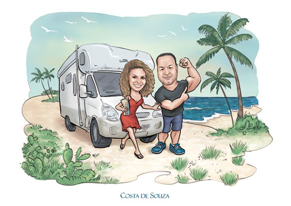 Caricatura de namorados para presente como quadro e capa de blog de viagens. O casal adora viajar de motorhome pelo litoral e esse clima de praia foi o tema do cenário.