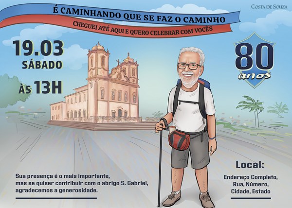 Caricatura e design para convite de aniversário de 80 anos com tema Igreja do Nosso Senhor do Bonfim, na Bahia. O aniversariante adora fazer as tradicionais caminhadas que são um grande evento em Salvador.